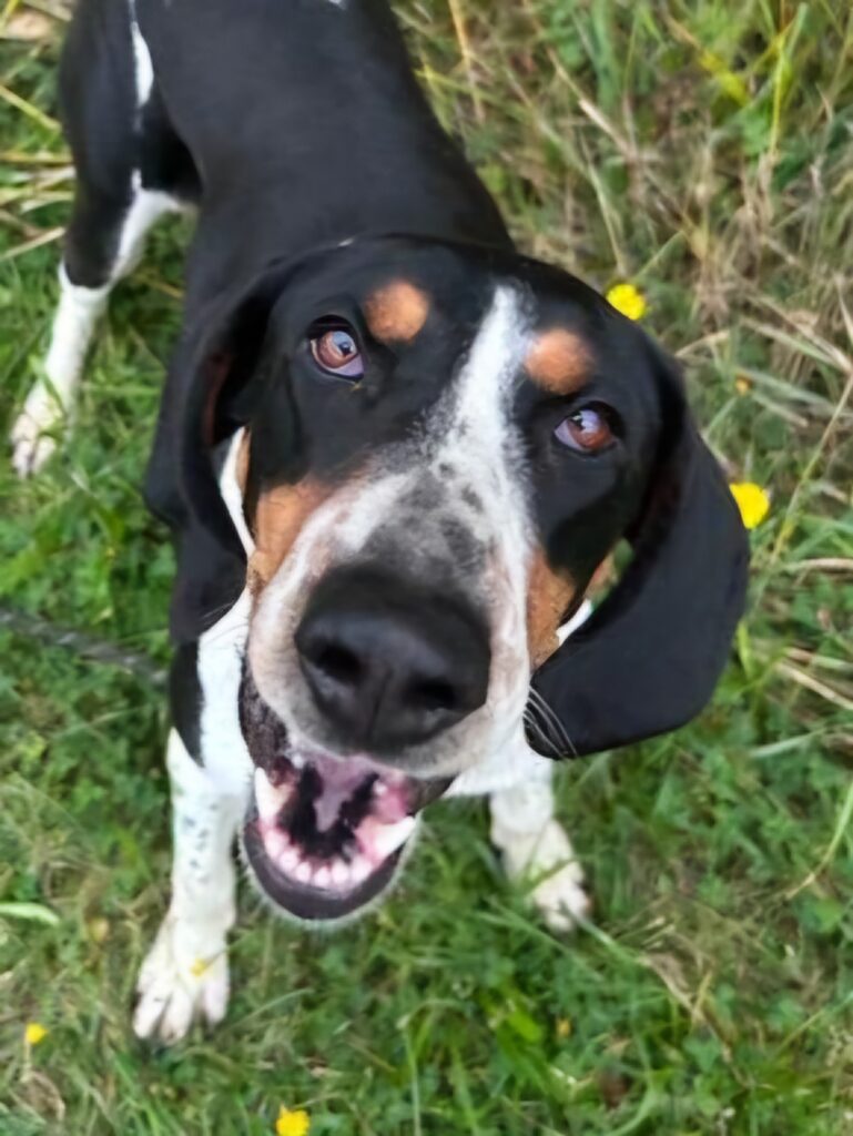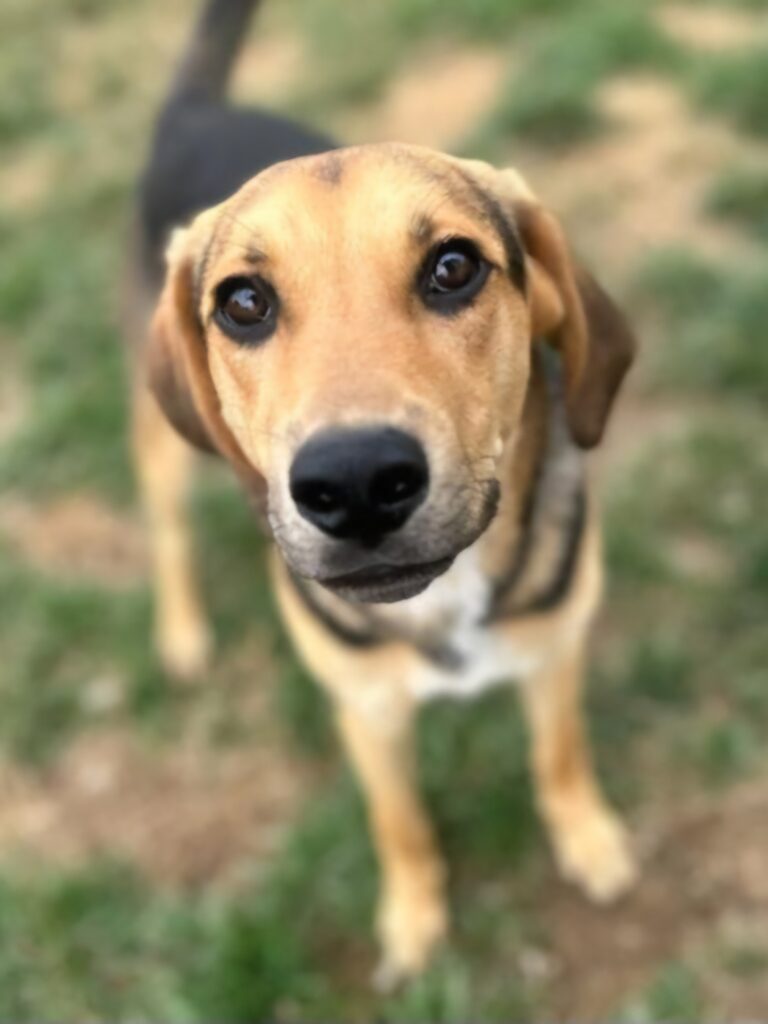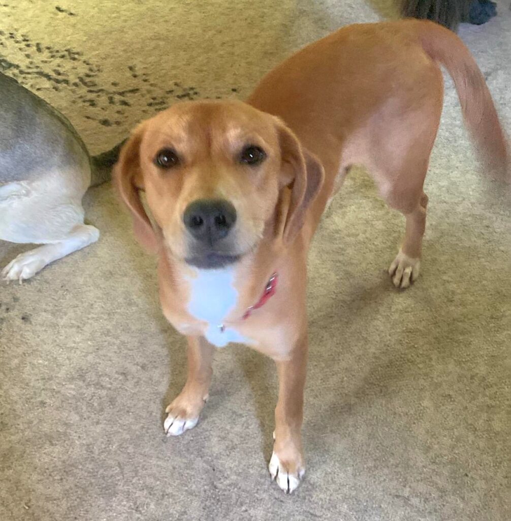 Hitch is a 32 pound, 11-12 month old foxhound mix and is good with other dogs. He’s grown up here with his siblings, and his best friend and playmate is Ruby, another hound.