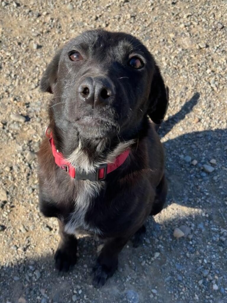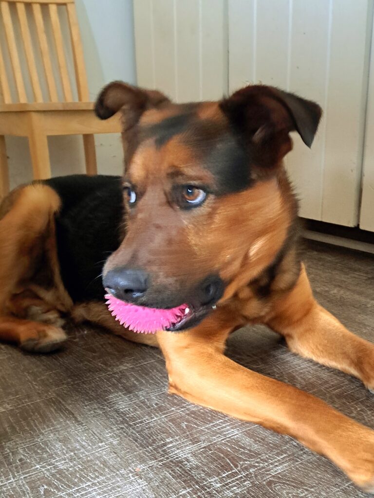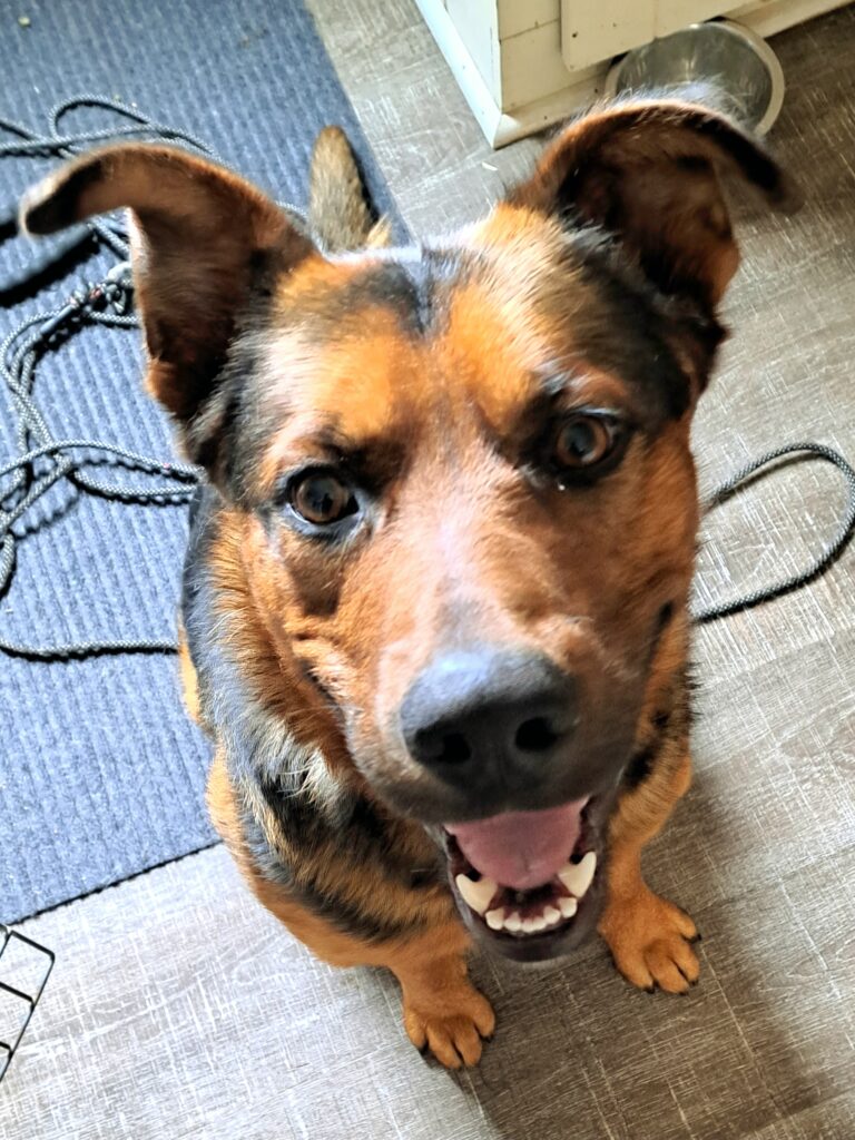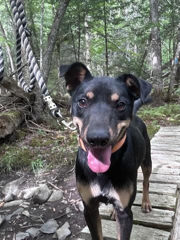 She is now well settled in and sits quietly in her crate waiting for outings. She loves a nice treat and a fun toy. She has an independent spirit, but she will bond with someone with a good sense of humor, and quickly. She’s always the dog who greats us with a smile, loves adventuring in the woods for a nice walk, and has great house manners. She understands humor and loves silly talk.