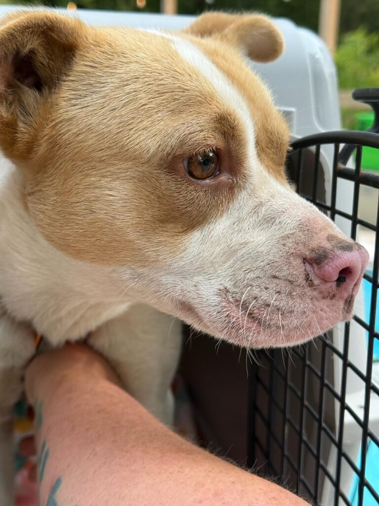 Sheena is a  3 to 4 year old, 40 pound, somewhat petite, midsized Amstaff mix, is polite with other dogs, loves puppies, and is an enjoyable companion. She’s learned that car rides lead to fun things, and she’s mastering traveling in the passenger’s seat, which she seems to think is very special. She walks so nicely on leash. She is crate trained and potty trained. She takes treats so gently, it’s truly endearing how careful she is when offered a cookie.