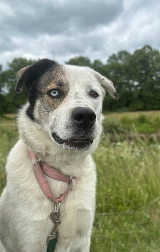 She can be nervous when meeting new people but warms up pretty quick with treats and pats. She does have some resource guarding when it comes to food and toys, but as long as other dogs respect her warning/correction it has never escalated. She can come off a little defensive when meeting new dogs, because of the situation she was put in before coming to us, but once she realizes the other dogs aren’t going to mess with her she wants to be their best friend!