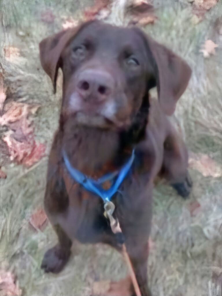 He’s a 4-5 year old chocolate lab who we found at a local holding facility, literally skin and bones- 35 pounds- and going crazy circling in a filthy kennel. Five months forward to now, he’s slowly gaining weight and muscle back, and is finally showing some emotional improvement; enough that he has learned basic obedience, “sits” before his meals, walks nicely on leash.