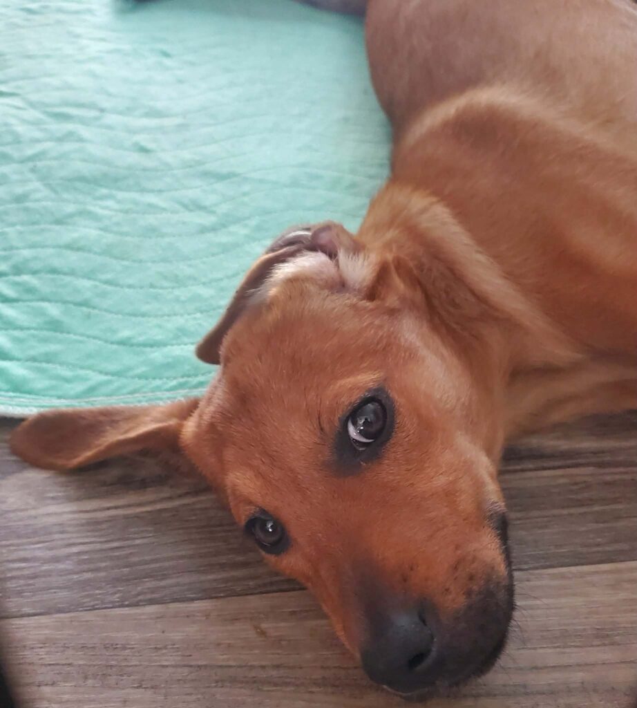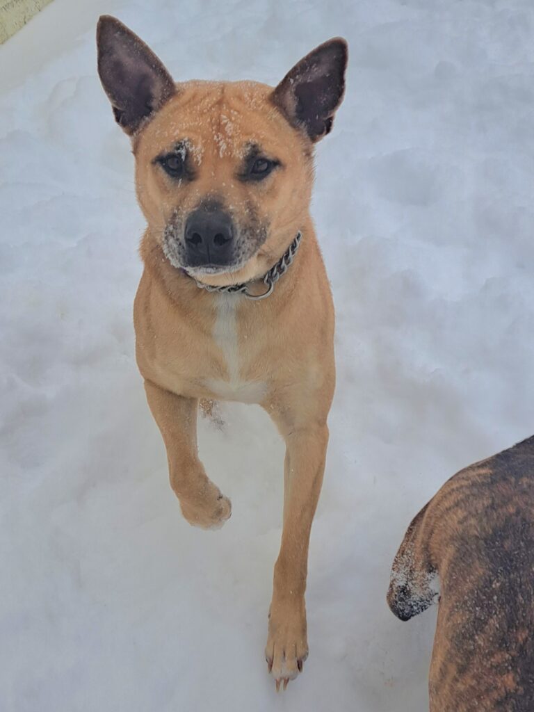 We have no idea what breeds mix Goldie is, but she’s a vivacious 4-5 year old, 42 pound girl who likes other dogs. She came in with her puppy, Kaia, who she raised lovingly. She still plays with her, but we are adopting them out separately.
