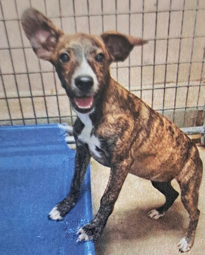 Kaia (Kie-yah) is a 9 month old peanut- she’s some sort of smaller staffy mix and she weighs 27 pounds. She came in with her mother Goldie, and is dog friendly, although rambunctious. She has a little twinkle in her eye and a bright cheery spirit.