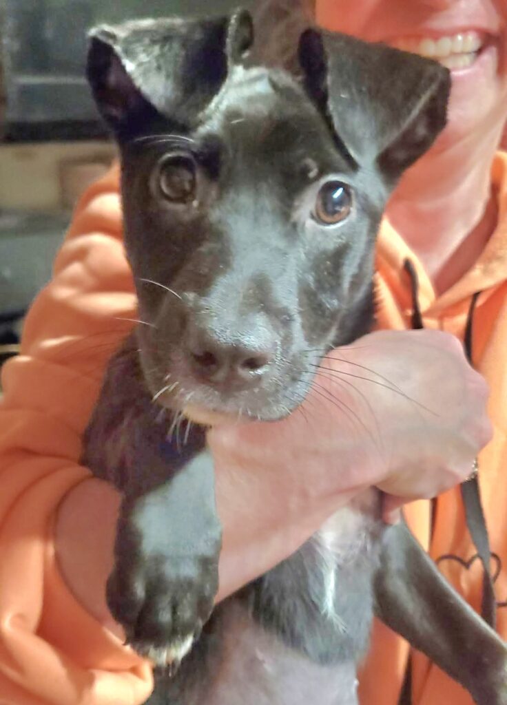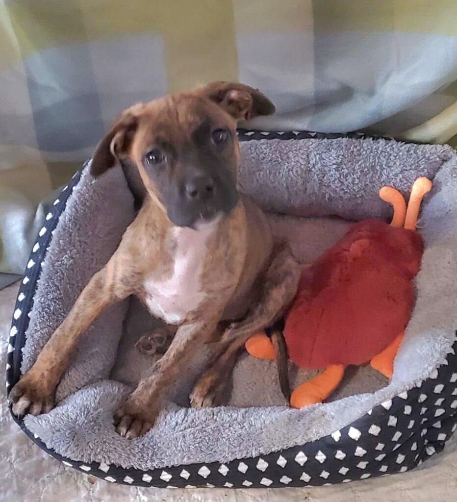 Right now, he’s only 22 pounds. And we’re thinking he may double in size as he grows. He has a sweet disposition and wants to catch up on his puppy-hood before it’s all gone. He’s being fostered in a multi-animal household and doing great!