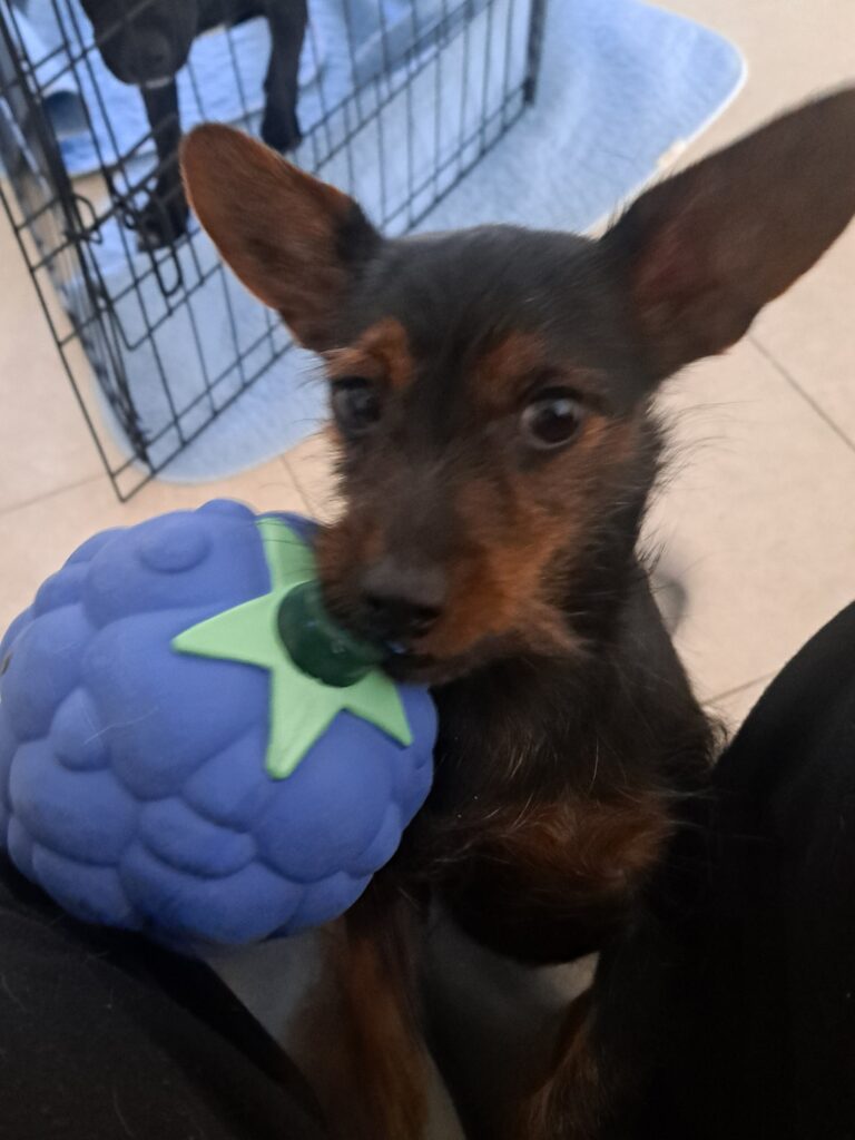 She absolutely loves to play and she’s a happy upbeat girl. She is happy to carry around a stuffy- she especially loves teddy bears. She needs to be an only dog.