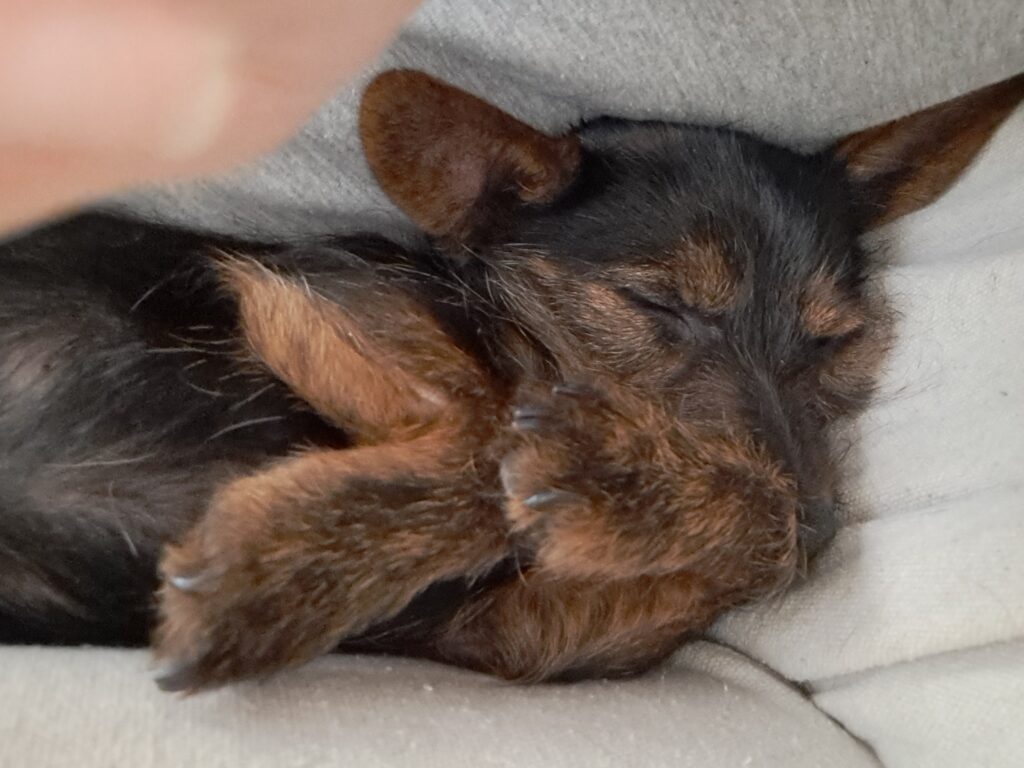 Levi is a Cairn Terrier. He likes to lounge in his donut bed all day. He’s hardly heard from, unless it’s time to go potty or eat a meal.