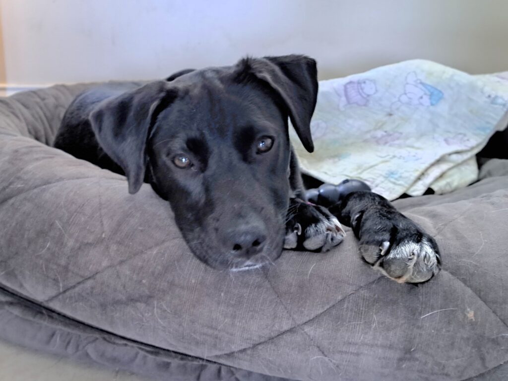 She has an old injury which we believe very strongly was a consequence of being hit by a car. It is healed and does not cause her any issue, but her leg does splay outward a bit when she walks. Doesn’t stop her from running around the play yard though!