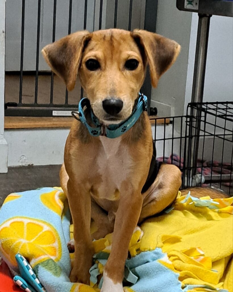 She’s wonderful with people, and has started basic obedience with us- she’s very treat motivated.