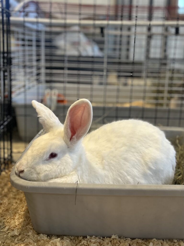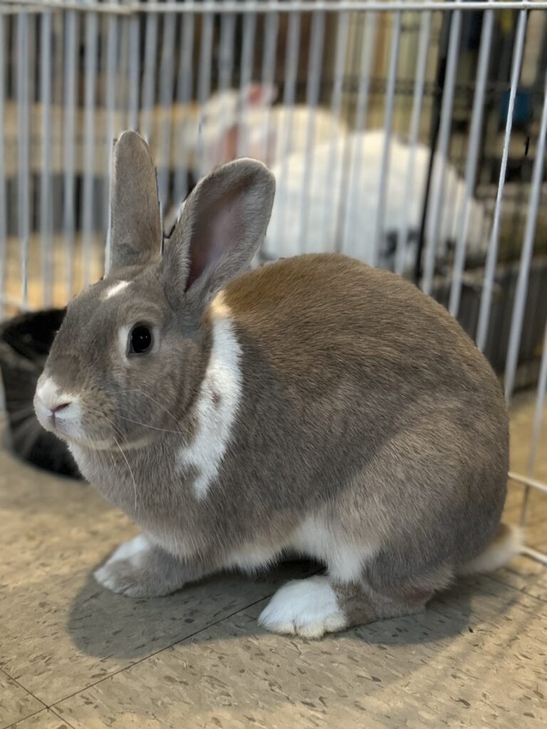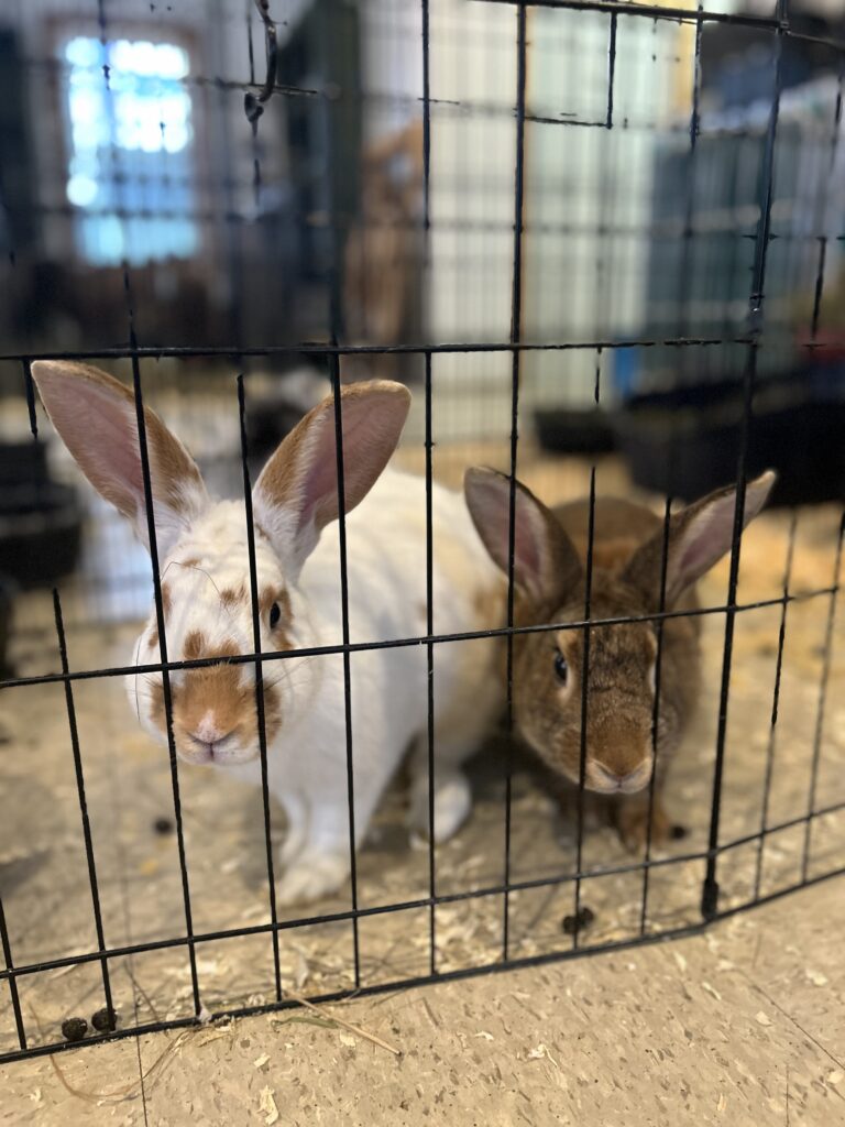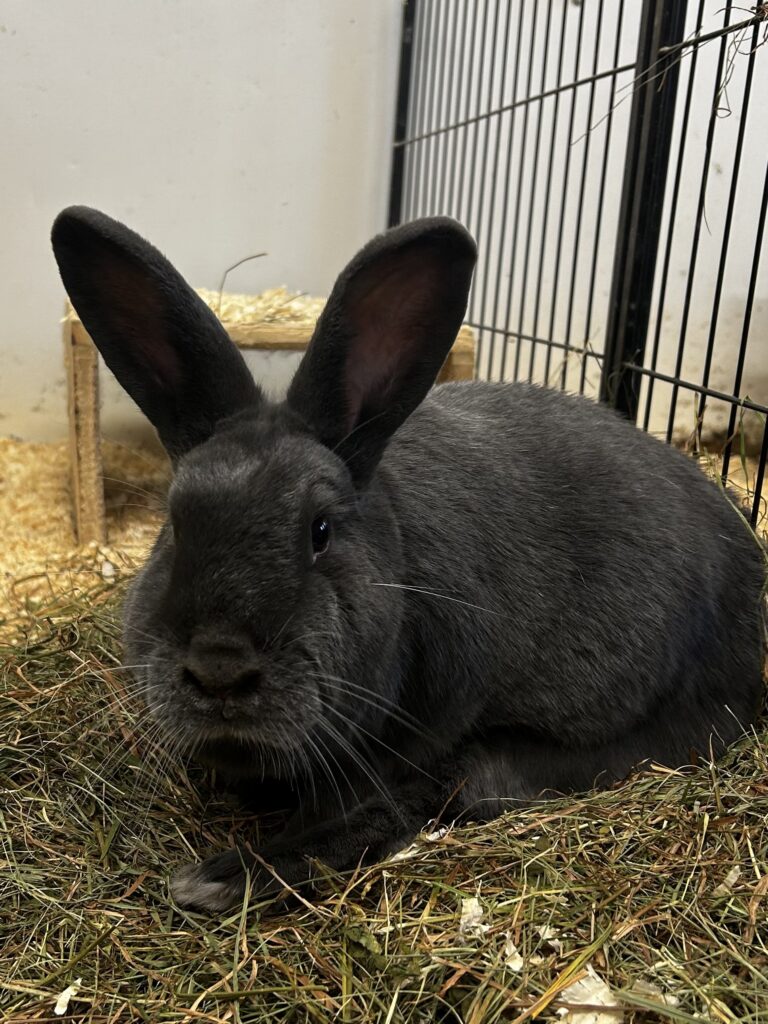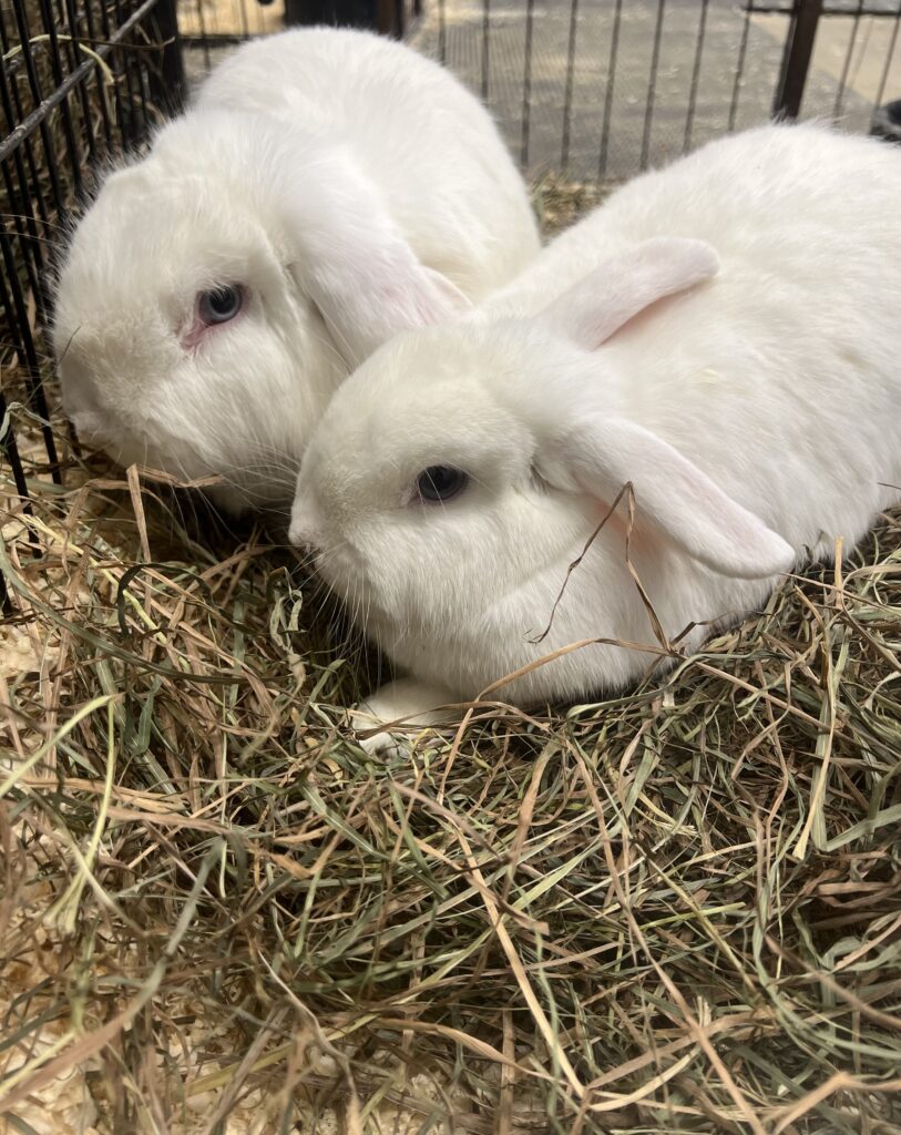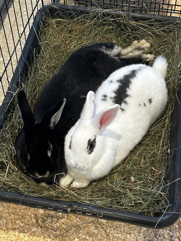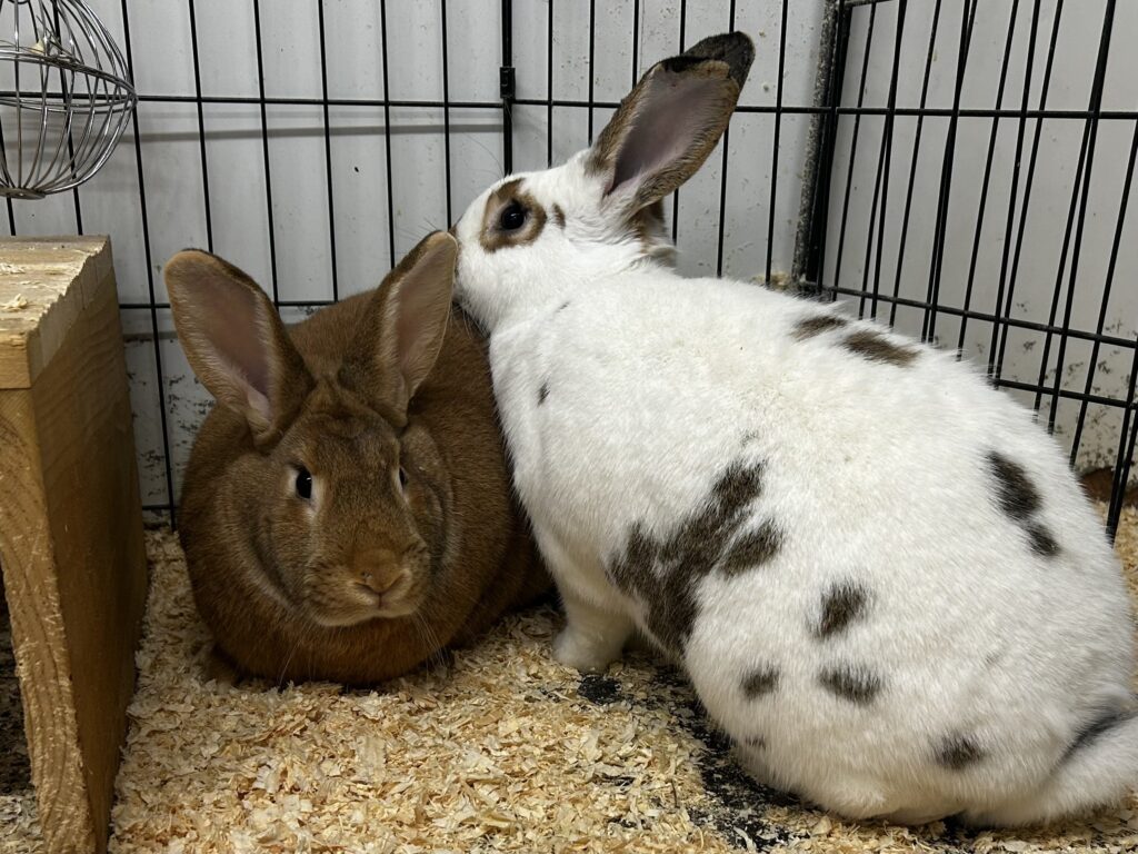 Nutmeg (left) and his friend Nims (right), are a bonded pair of rabbits who would love to find a home together! Nims came to the sanctuary when she was about 1 year old after being found in someone’s backyard, most likely a result of her being dumped by her previous owners. It took us a while to find her perfect match, but when Nutmeg came to us this past fall, they quickly became buddies. Nutmeg is an adventurous rabbit who loves saying hi to everyone who comes by, while Nims is shy around new people. Nutmeg loves his zoomies and to dig in his hay, and every so often Nims will join in! They’re such lovely rabbits who truly balance each other out.